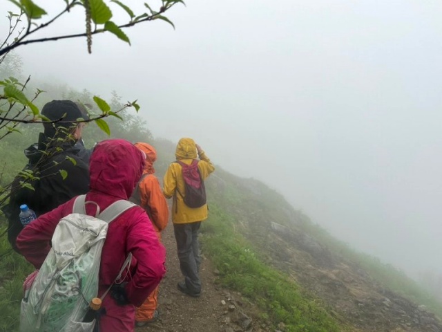 雨は降ったり止んだり。真っ白で景色が見えなくて残念。黙々と進む(会のHPより)