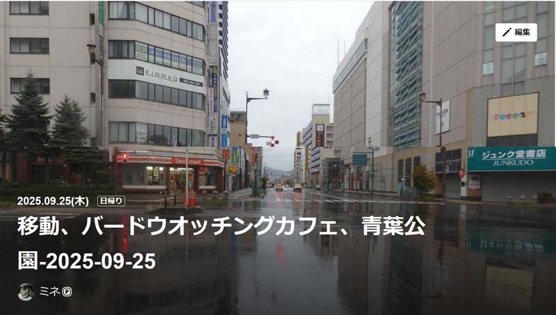 千歳桂病院前・BirdWatchingCaffe・千歳桂病院前13:09=13:20林東公園入口-林東公園-青葉公園・ 図書館前16:24=16:33もりもと本店Bus停・千歳第一Hotel(泊)