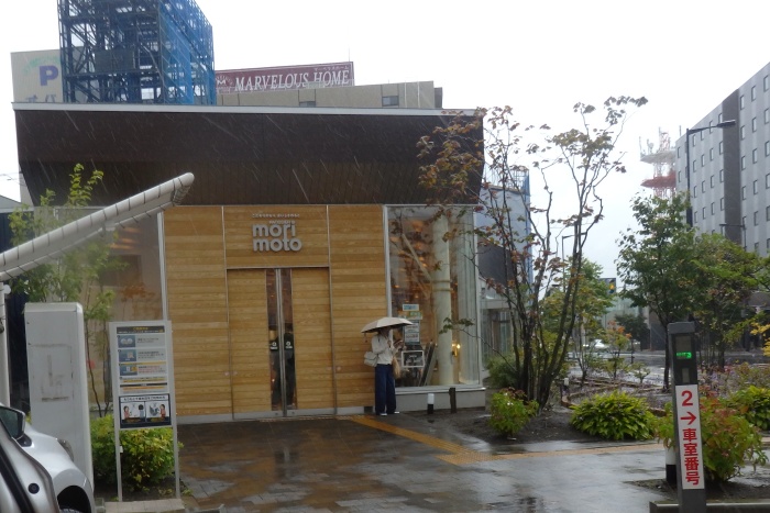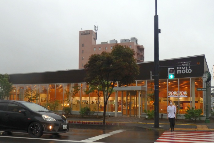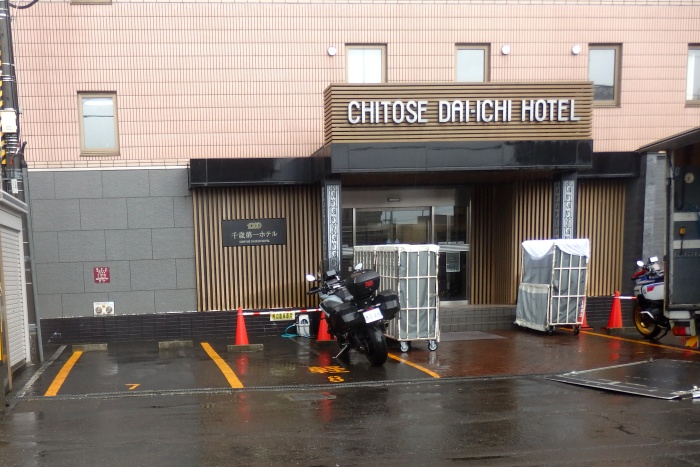 千歳では激しい雨・・・千歳第一Hotelは見えてるが、分かりにくく「morimoto]があります