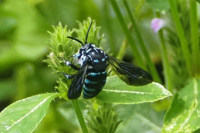 前回のルリモンハナバチは羽根が傷つきボロボロだったが、今日の種は綺麗で別種です