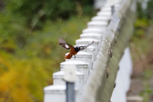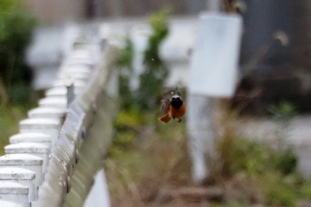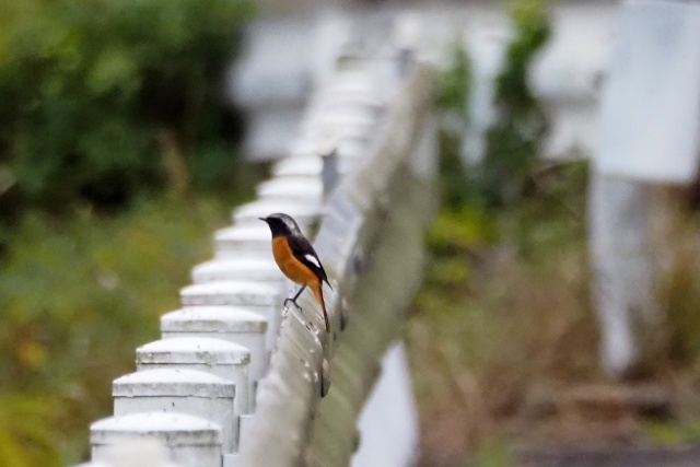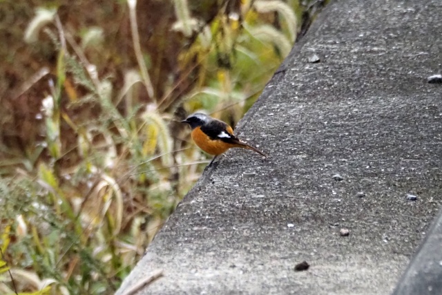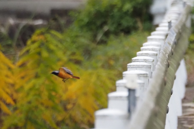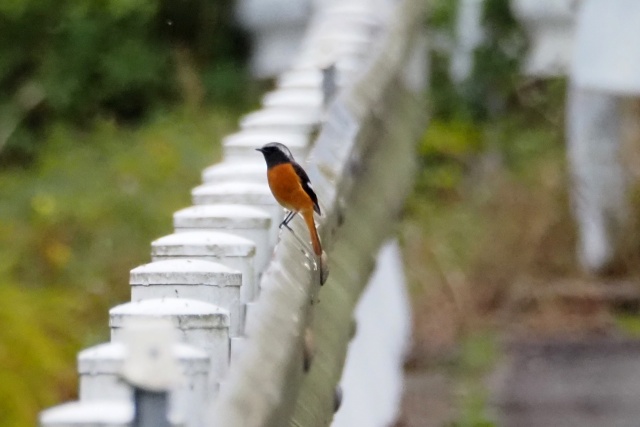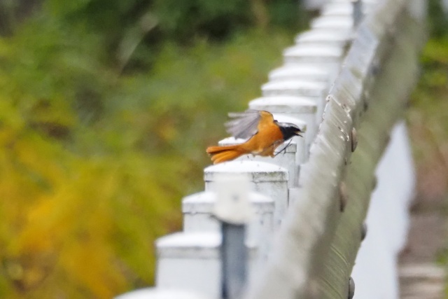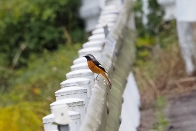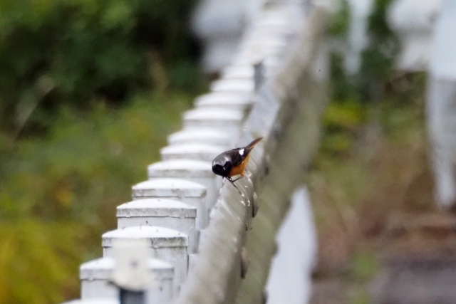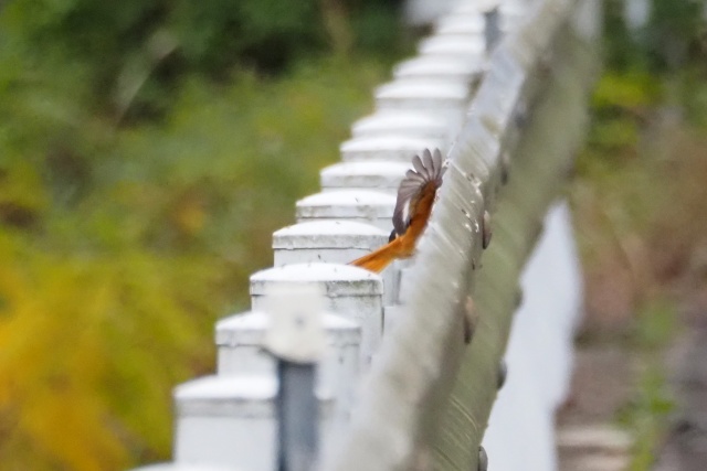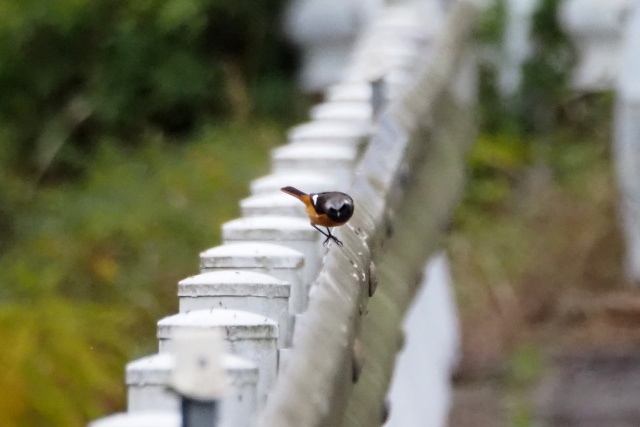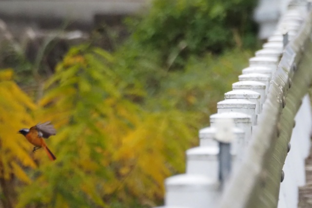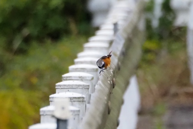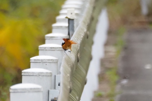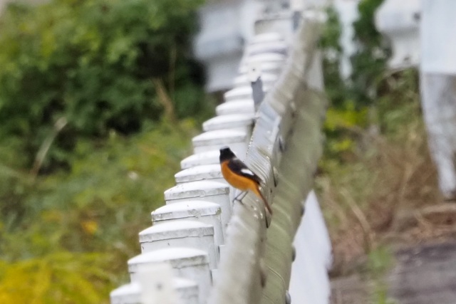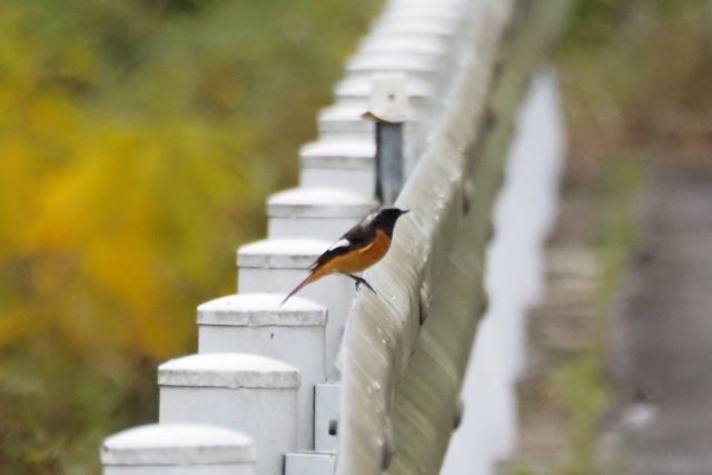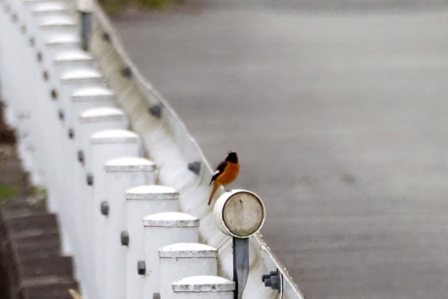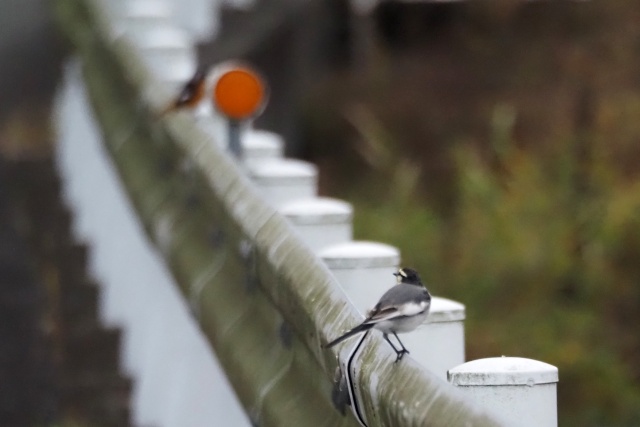 川沿いのガードレールにセキレイその先にジョウビタキ雄