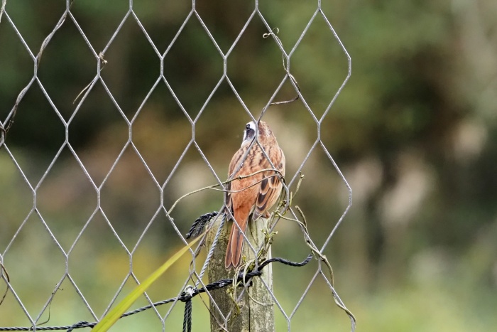 かやぶき屋根の奥でチッチっと鳴いていたホオジロ、残念ながら網の奥でした