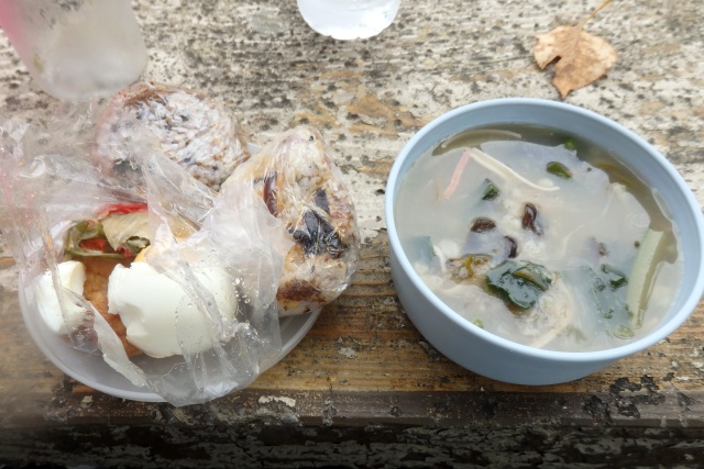 今日も定番🍙🍙・昨日のLunchの余らせた物・BoilEgg・冷製和スープ・・・一気です