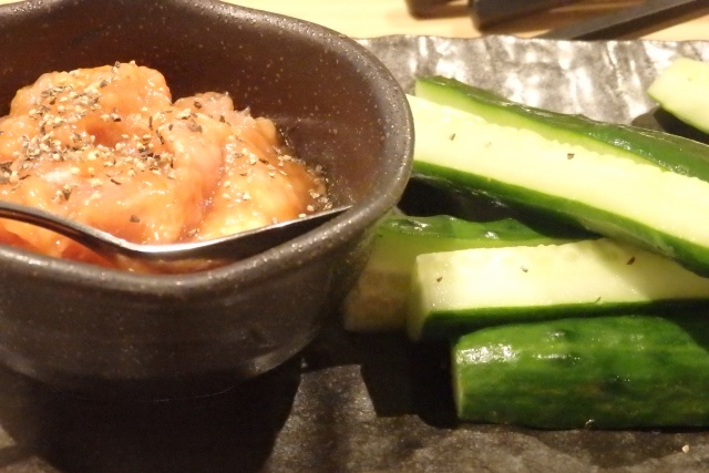パリパリキュウリ 旨辛ねぎまぐろディップ(ディップに辛子明太子が混じっている)