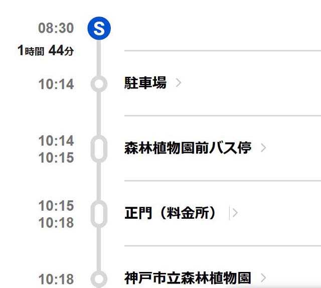 武庫之荘7:36=7:39西北43=7:57三宮・地下鉄三宮8:07=8:18谷上-8:25登山口(休)40-休憩-10:15神戸市立森林植物園15:50=16:00北鈴蘭台04=16:22新開地34=16:55西北57=17:00武庫之荘