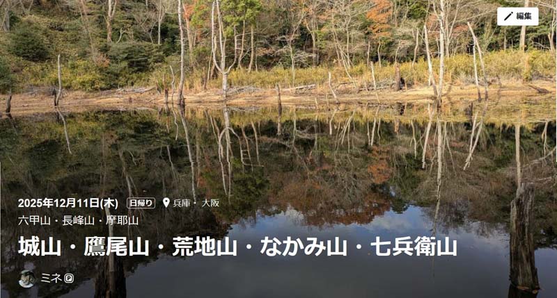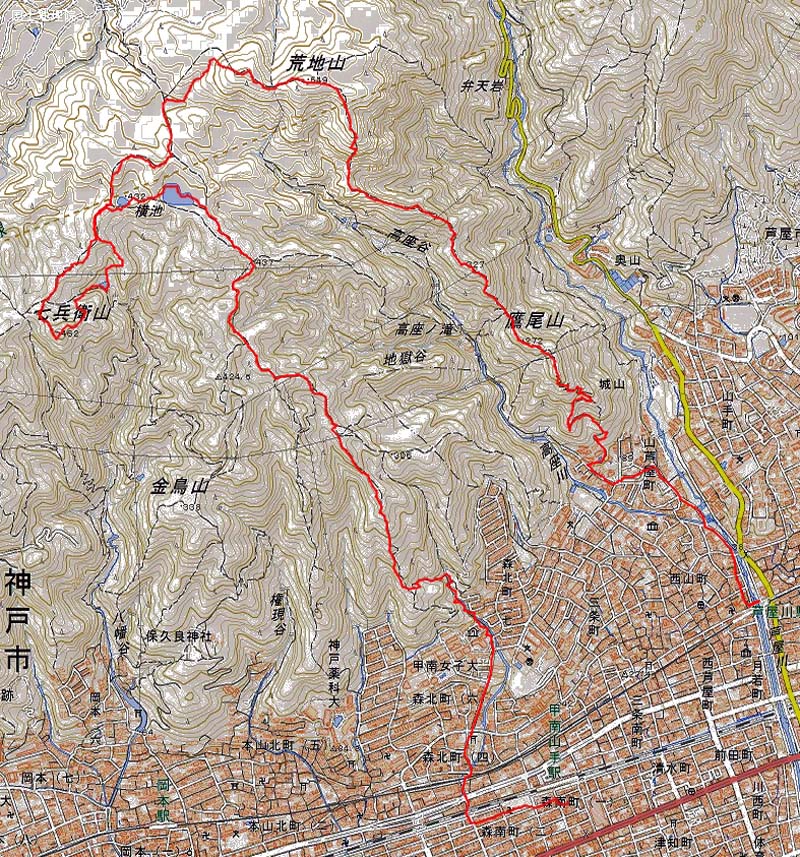 武庫之荘8:16=8:19西北=8:45芦屋川9:15-9:20ストレッチ30-10:8城山-10:50鉄塔(休)-岩梯子-11:50サンデーモーニング横展望所(LunchTime)-12:25荒地山-13:31七兵衛山(休)-14:19横池(雌池)-14:28横池(雄池)-14:39ロックガーデン-15:28分岐-15:27甲南山手登山口-16:03銭湯(森温泉)-17:04うどん屋(御影)-芦屋川18:18=18:33武庫之荘