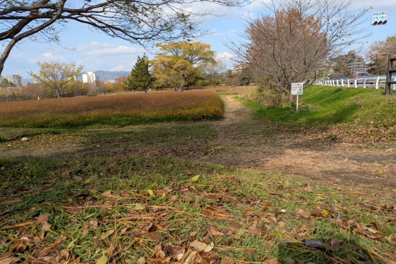 一番西側の阪急電車の踏切を渡り尼宝線一番目の信号を左折し武庫川へ・・・ここから車道に上がる道がある