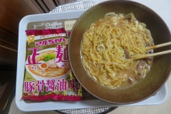 このラーメンは尼でも入手可能だが、3食入りで少々お値段張るが味が深く美味しい。通常早朝開店前通過