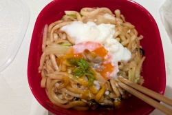 23日焼うどん弁当温玉添え・24日チキン南蛮弁・25日新蕎麦出汁でシンプルうどんは味が深くGood