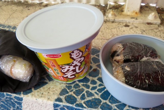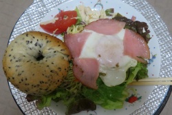 朝食:昨日のサラダにハムエッグ載せ娘特製ベーグルパン 今日の行動食は小🍙🍙、昨日のBoilEgg&Cup麵