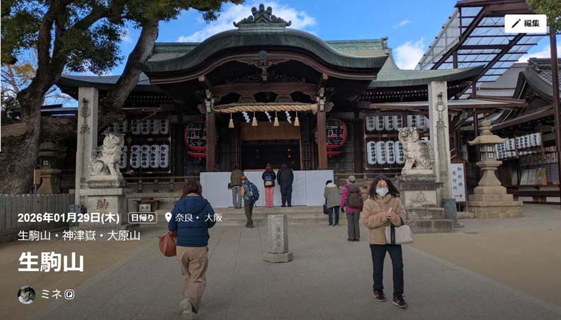 武庫之荘8:01=8:17大阪梅田・大阪36=:53鶴橋54=9:05生駒駅-10:17生駒山 寳山寺 (生駒聖天)-山上(LlunchTime-興法寺-石切駅-14:08石切劔箭神社(いしきりつるぎしゃ)-14:29石切駅33=14:54鶴橋-東上温泉・居酒屋「まん丸」-鶴橋17:50=168:0大阪・大阪梅田178=18:2武庫之荘