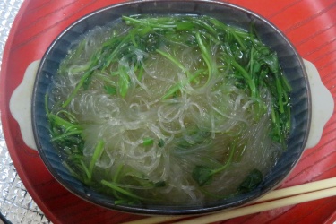 夜は食費を押さえ安価なセミ餃子にしたが、物足りなく小さな緑豆春雨と三つ葉をうどんスープで満たす
