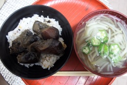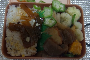 朝:茄子煮付け丼&オニオンスープ お弁当:筑前煮中心 昼過ぎ、あまりにも寒くちょっと暖かなこれ↑↑