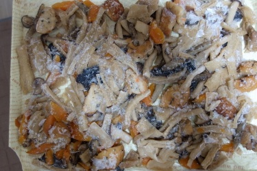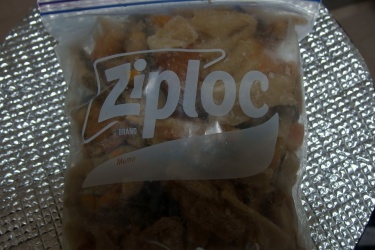 ストックの割干し大根の筑前煮を平たいトレーに並べ、(塩サバ込み)凍ったらジップロックに詰めます