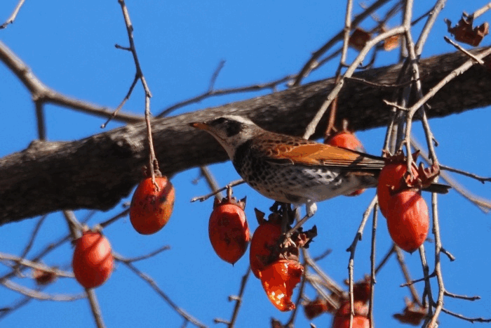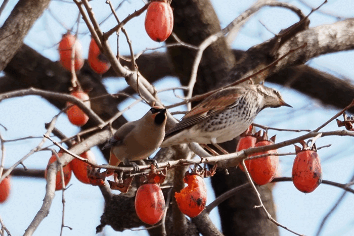 ツグミが次々と飛び込んで来るが、レンジャクは混じっていません